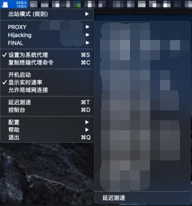 4、点击 ClashX 状态栏图标，将「出站模式」选为「规则判断」，在「Proxy」中可以选择自己喜欢的线路后，并将 FINAL 设置为 「Nexitally」。点击「设置为系统代理」即可开始使用。