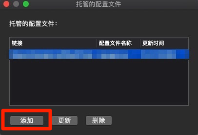 3、启动 ClashX，点击状态栏中的 ClashX 图标，依次选择「配置」、「托管配置」、「管理」，在弹出的界面点击添加。