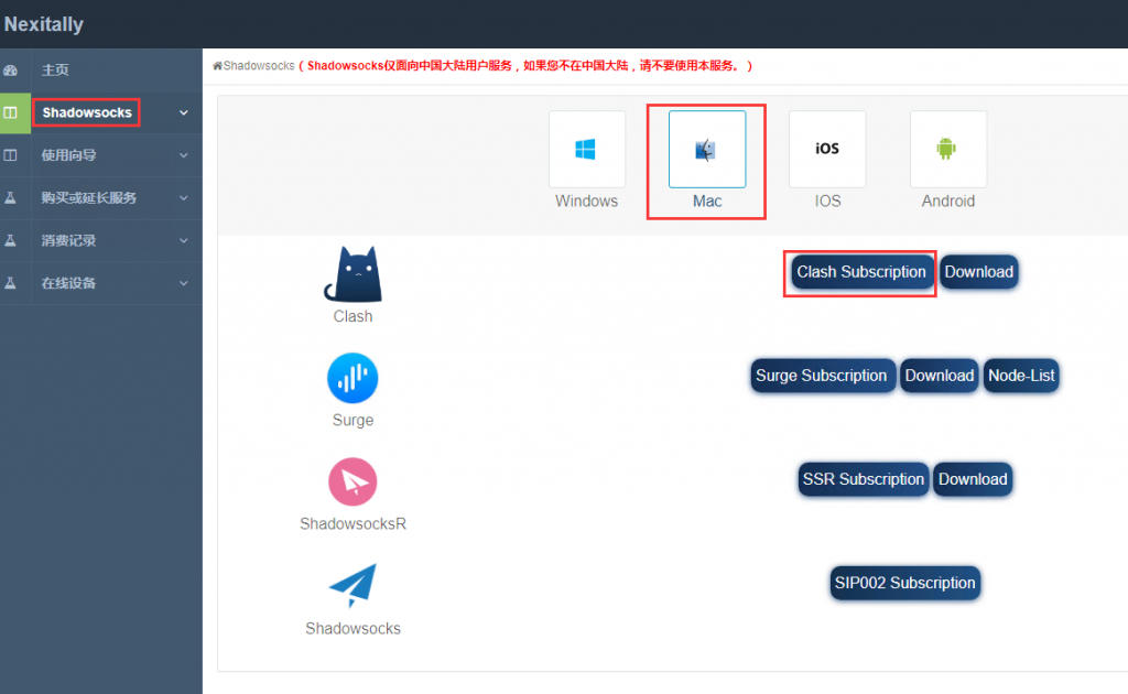 2、登陆我们的官网用户中心，点击左侧“Shadowsocks”，点击“Mac”-“Clash”-“Clash Subscription”，以获取Clash订阅链接。